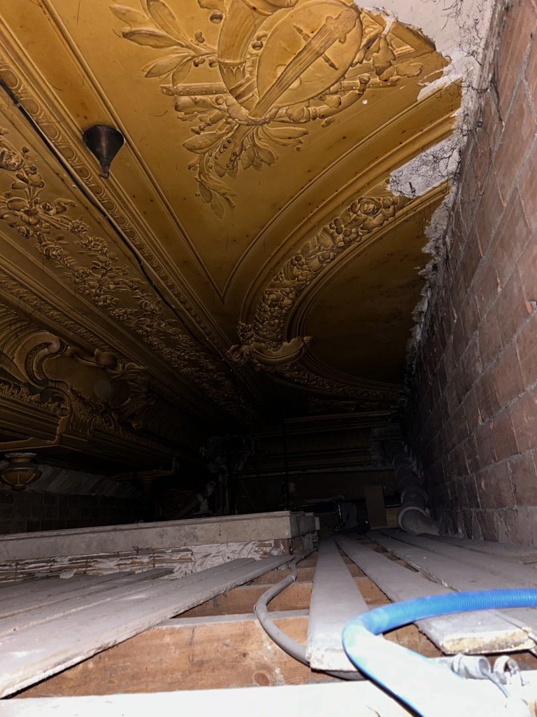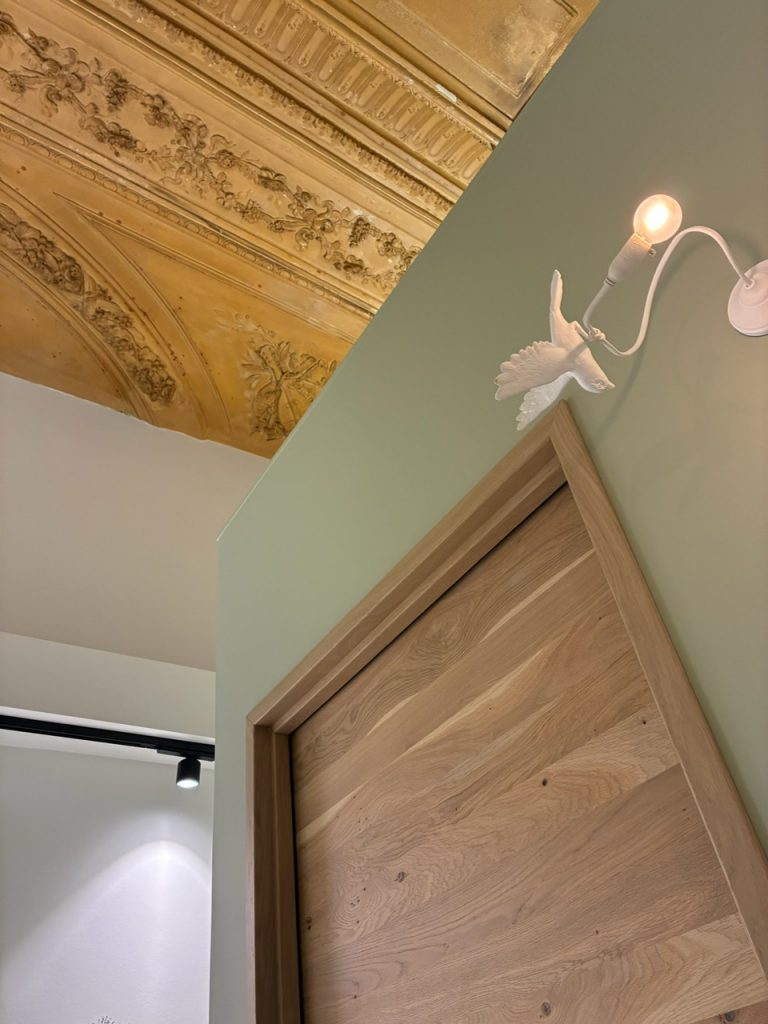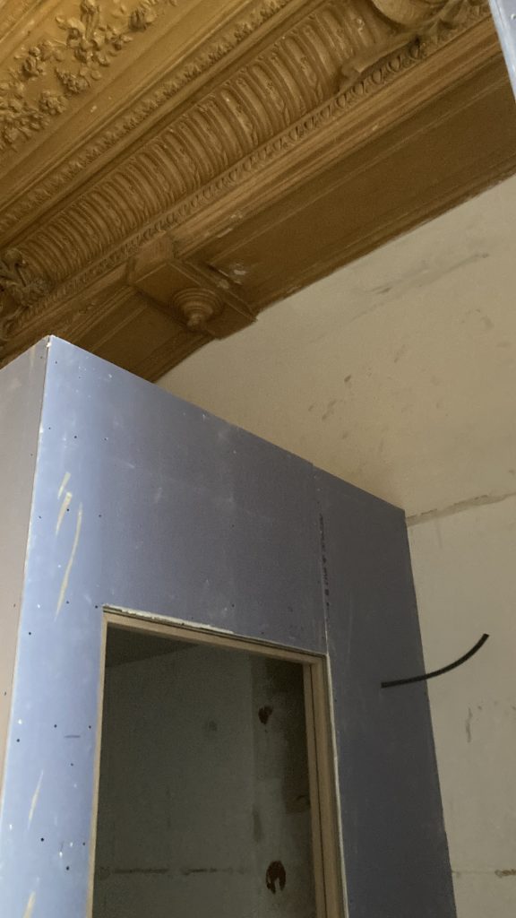 Lors du relevé de mesure, nous avons découvert au-dessus du faux plafond existant un plafond ancien mouluré. Plutôt que de le cacher, nous avons révisé la conception architecturale. Le défi a été d’intégrer l’éclairage technique et de traiter l’acoustique du cabinet sans masquer cette hauteur sous plafond retrouvée.