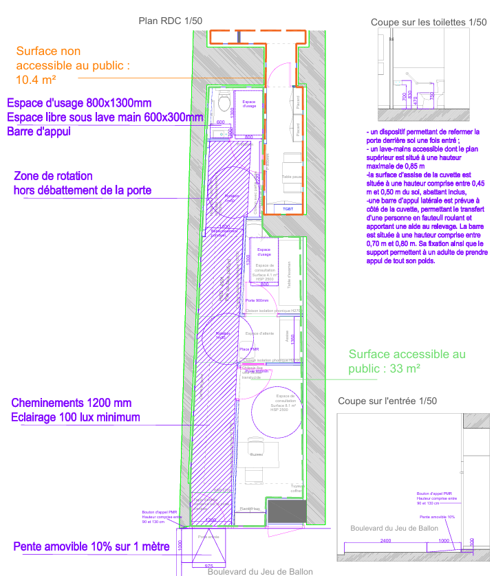 Une grande allée à composer permet d’avancer dans l’espace et de positionner l’espace d’attente hors de la visibilité des passants. L’aménagement du cabinet infirmier et esthétique présente un espace est plus large à l’avant qu’au fond de la boutique, le plus petit bureau se situe le plus loin et le grand à l’avant bénéficiant de la lumière naturelle.